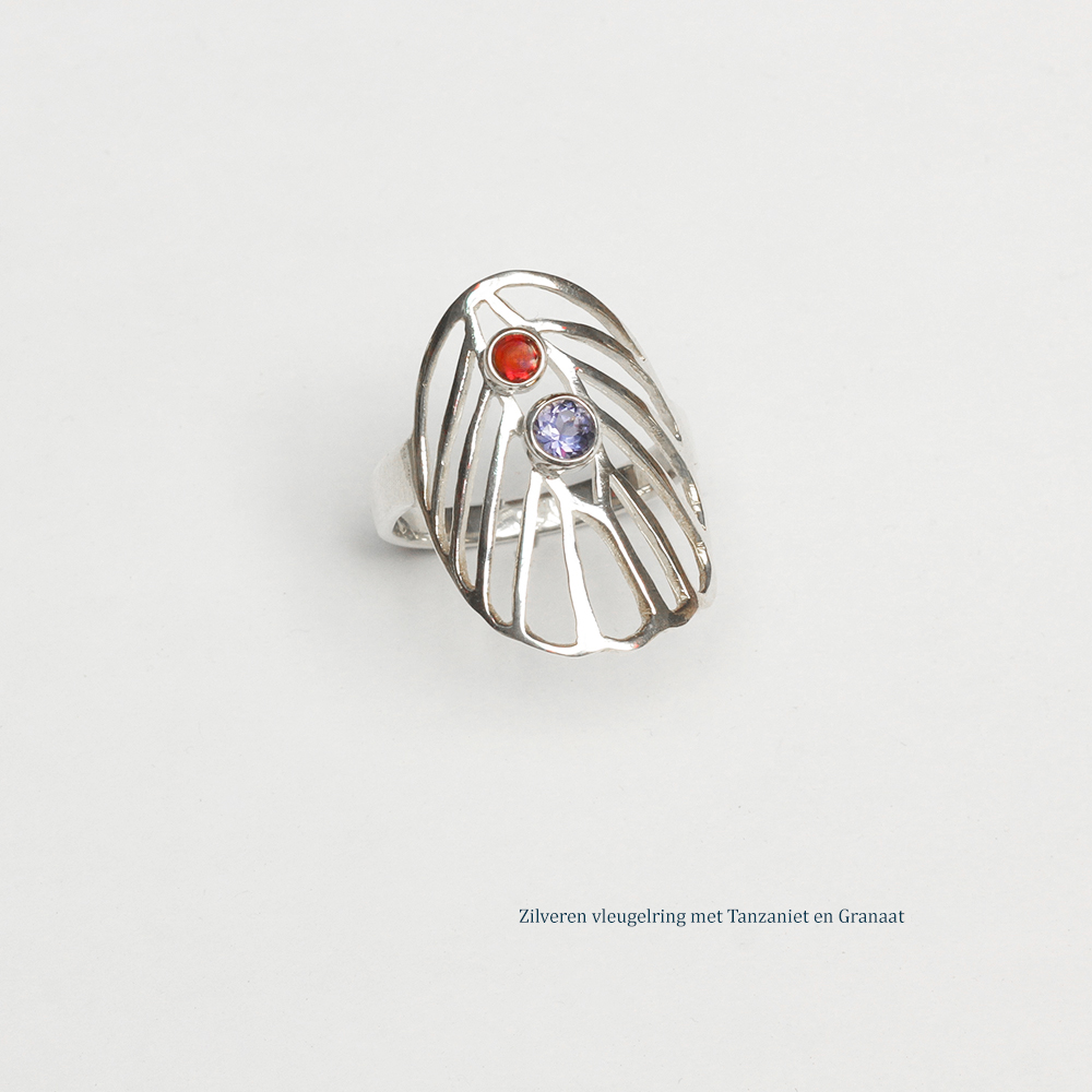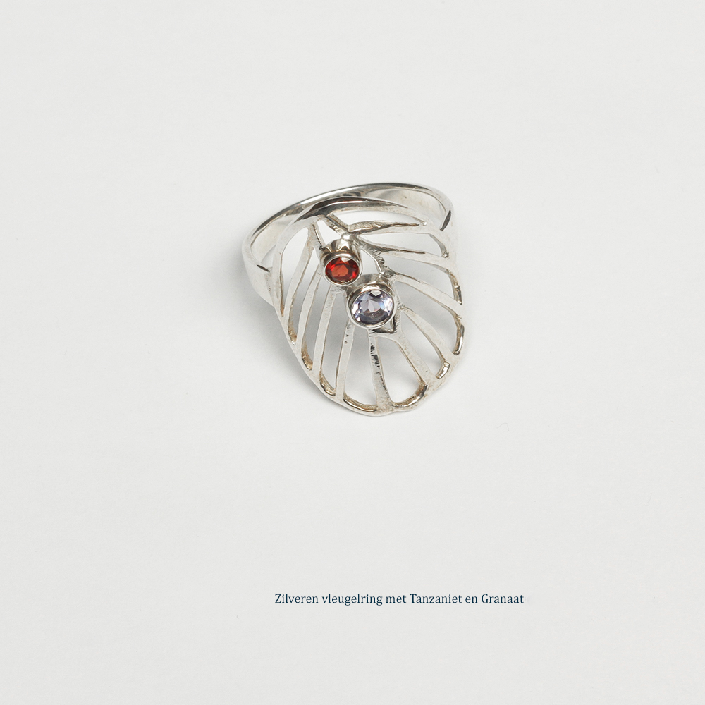 Zilveren vleugelring met tanzaniet en granaat geïnspireerd op de vleugel van een koolwitje. Verkrijgbaar met stenen naar keuze.